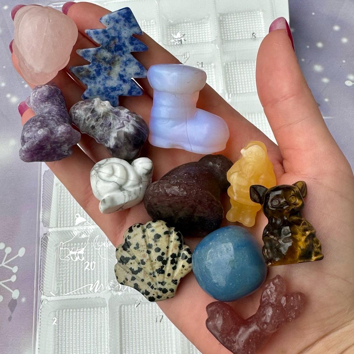 Please place the calendar facing long ways and flat on a hard surface to avoid any crystals falling out and breaking when opening each slot. It will also prevent the carvings from falling out of their slots inside the box.
