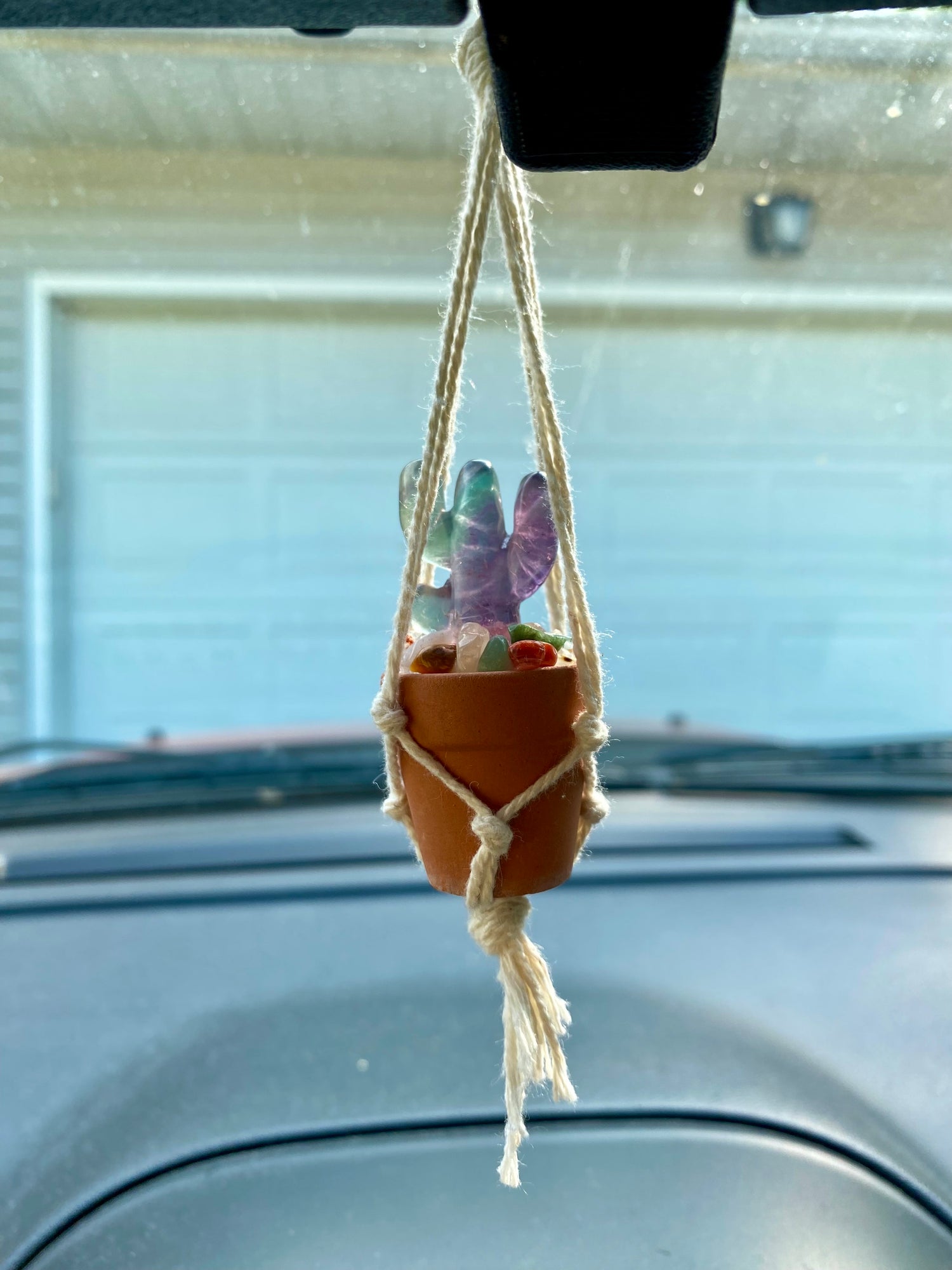 PLEASE NOTE that the colors in quartz and fluorite can fade in the sun, so please keep that in mind when you put your macrame cactus hanger on your rear view mirror or any other place that would keep it in the sun for long periods of time.